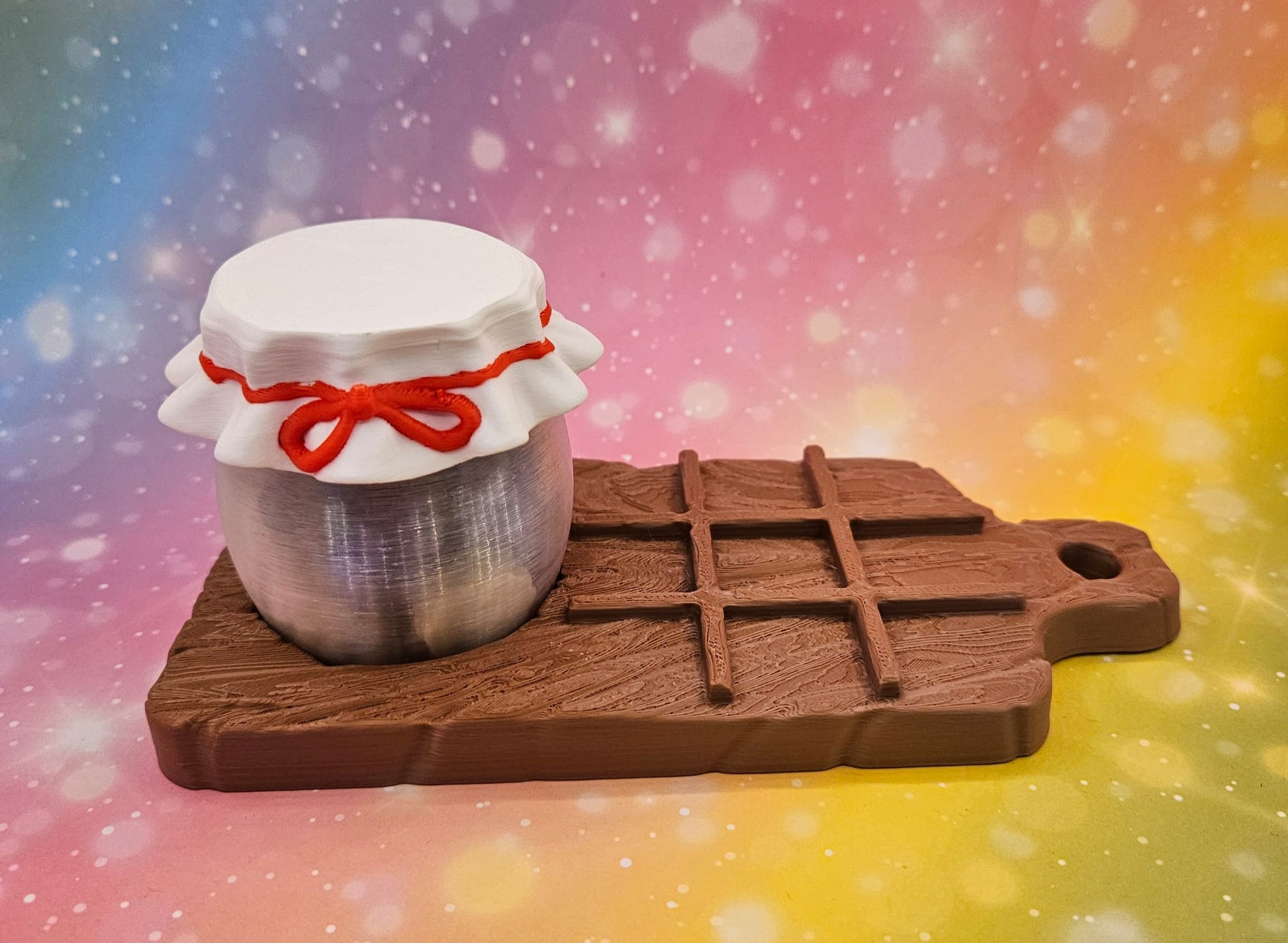 Dieses Set ist nicht nur ein klassisches Spiel, sondern auch ein dekoratives Highlight für jeden Tisch. Das Zusammenspiel aus 3D-gedrucktem „Holzbrett“, originellen Mini-Spielsteinen und passendem Aufbewahrungsglas macht jedes Spiel einzigartig.