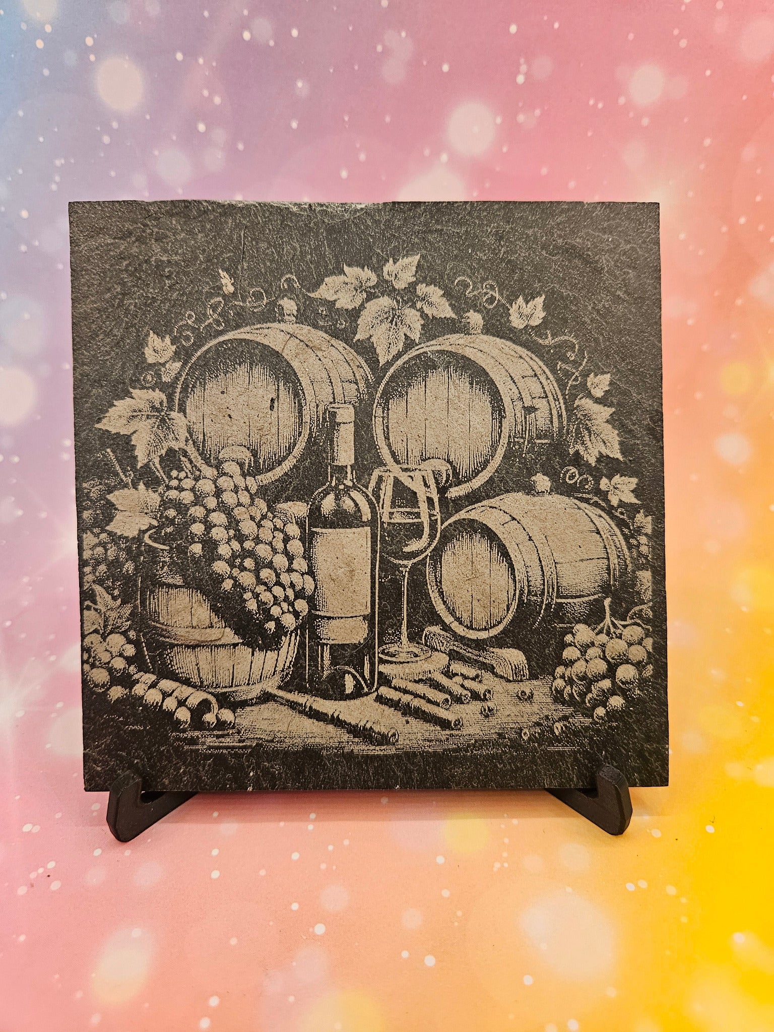 Lasergravierte Schieferplatte „Weinfässer & Trauben“ – edle Wein-Deko